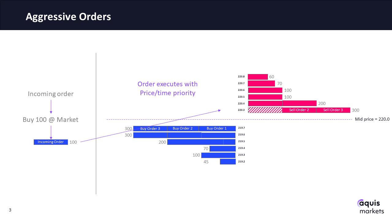 The execution priority of the order book determines which of the resting sell orders this aggressive order will trade with. The CLOB has a price/time/size priority so this incoming order will first interact with the lowest price level (220.3) and the first order submitted at that price level (Sell Order 1).
