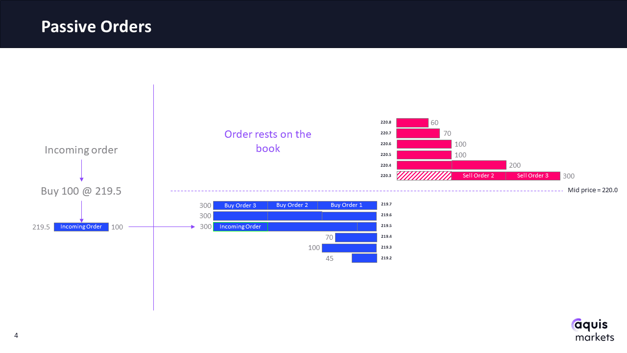 A passive buy or sell order would add liquidity (orders) to the book. Using our example, a firm could choose to submit a buy order for 100 shares with a limit price of 219.5. This order would not immediately interact with the offer side of the book, it would not cross the spread, and would therefore rest on the bid side.