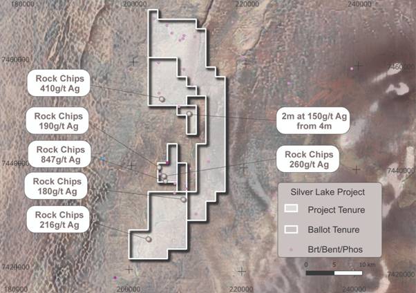 Figure 2: WSBN Silver Lake Project with tenure and a selection of rock chip assays from within the project area. Drill holes for Barite, Bentonite and Phosphate also shown with further work required to validate and look at this aspect of the project.