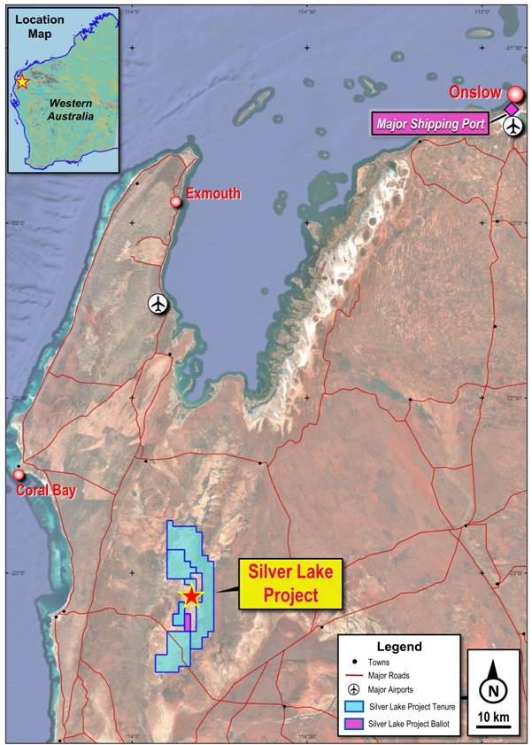 Silver Lake is located 135km south of Exmouth and 200km southwest of Onslow, the main port for the region's iron and LNG exports, which is a multi-user port. The project site is accessed from either the North West Coastal Highway or Minilya-Exmouth Rd and then on well-maintained unsealed station roads. (Figure 1).